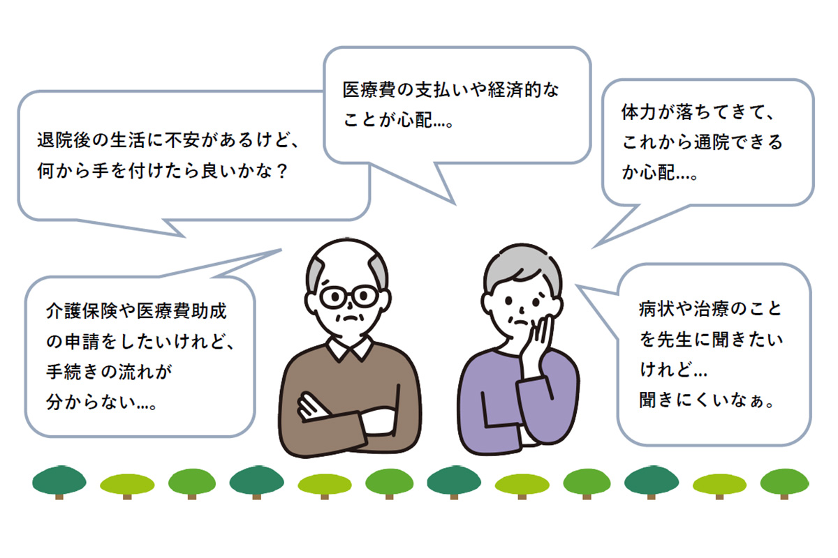 病気やケガをすると、健康な時に考えてもみなかった、さまざまな問題が起きます。当院では社会福祉の専門職である医療ソーシャルワーカーや退院調整看護師が、患者さんやご家族から療養中に起こる心理的・社会的・経済的なご相談をお受けし、解決策が見つかるよう、一緒に考え、サポート致します。
